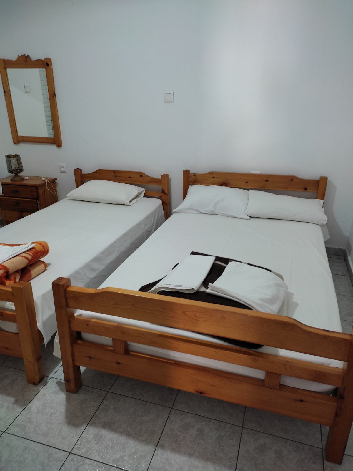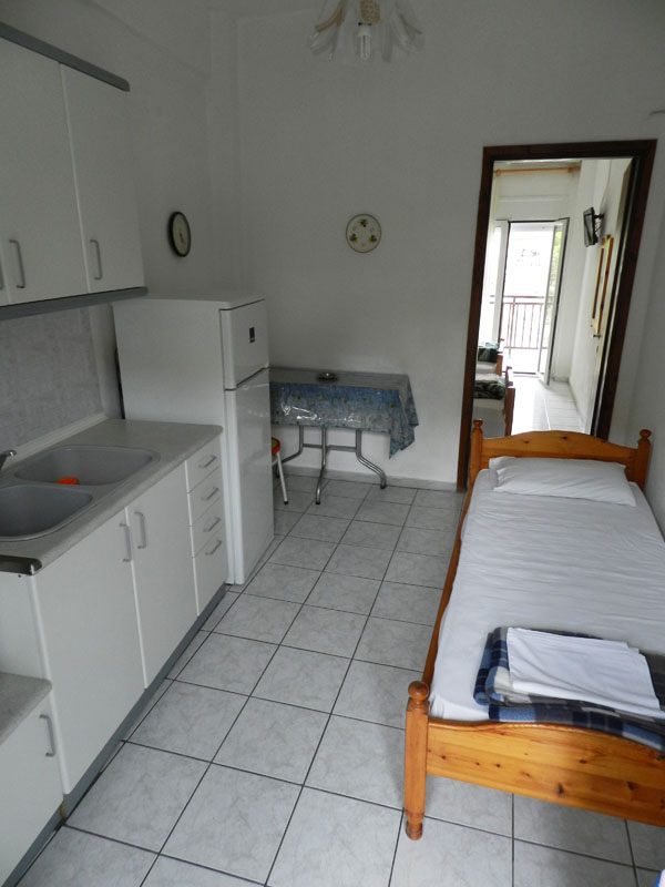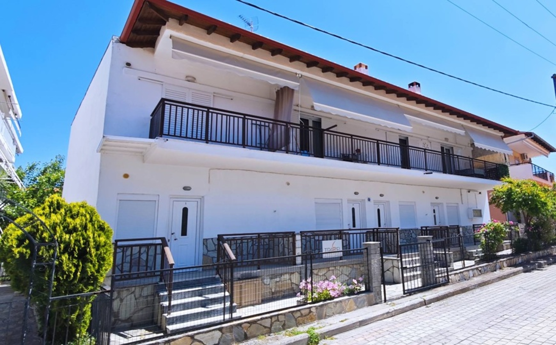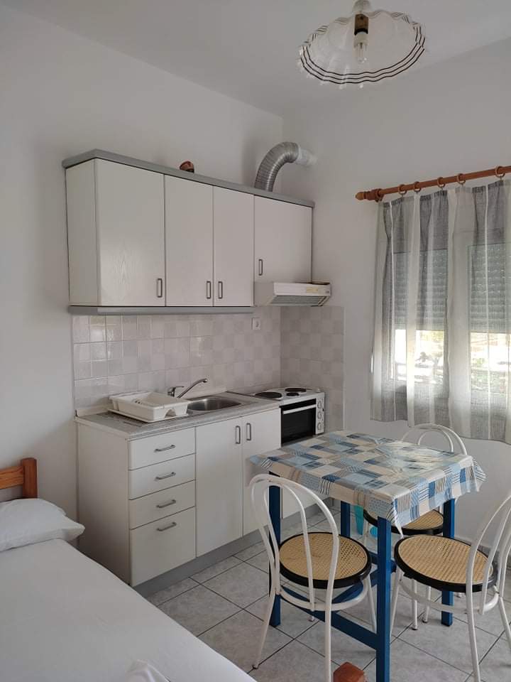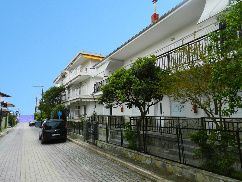 Сместување: Располага со апартмани за 3 и 4 лица. Четири апартмани се наоѓаат на високо приземје (бр.1, 2, 3, 4) и еден на прв спрат (бр.5). Се состојат од кујна каде има кревет на отварање или лежај со грчки димензи,голем фрижидер, шпорет БЕЗ рерна, основни садови за соодветниот број на лица , ТВ, интернет, купатило, клима, спална соба со брачен кревет или спална и единечен кревет, две тераси со поглед на улица и поглед на двор. Паркинг.